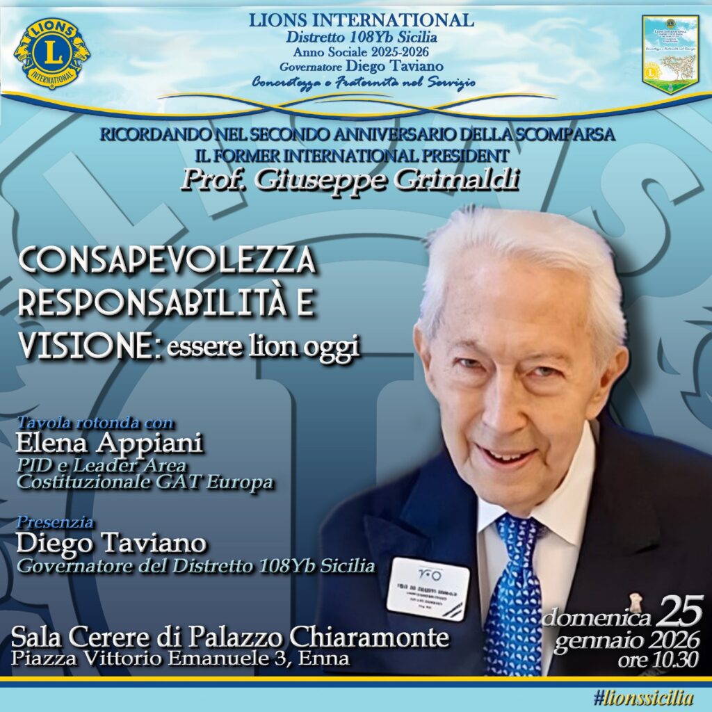 Enna – Il Distretto Lions 108Yb Sicilia dedica un momento di alto valore istituzionale e culturale alla memoria del Former International President (FIP) Giuseppe “Pino” Grimaldi nel secondo anniversario della sua scomparsa, con l’incontro dal titolo “Consapevolezza, responsabilità e visione: essere lion oggi”, in programma domenica 25 gennaio 2026, alle ore 10.30, presso la Sala […]