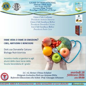 Si è svolto martedì scorso, presso l’Istituto comprensivo “Reina” di Chiusa Sclafani (PA), il service sull’educazione alimentare promosso dai club Lions Sambuca Belìce e Corleone, un momento di confronto e crescita dedicato ai più giovani. Parlare di cibo significa parlare di salute, prevenzione e consapevolezza. Durante l’incontro, la presidente del club Sambuca Belìce, Donatella Calcara, biologa nutrizionista, ha accompagnato studenti e studentesse a riflettere su cosa significa mangiare in modo equilibrato, imparando a distinguere tra abitudini corrette e falsi miti, con un linguaggio semplice, scientifico e vicino alla loro quotidianità, perché “seminare conoscenza oggi vuol dire costruire adulti più consapevoli domani”, come ha commentato Donatella Calcara. Il service è stato possibile grazie alla collaborazione dei soci del club Lions Corleone (presidente Antonio Navarra) e la collaborazione del dirigente scolastico Arianna Ditta. #lionssicilia #chiusasclafani