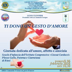 Ieri il Lions club Riesi ha voluto donare un “gesto di gentilezza” ai bimbi della scuola dell’infanzia dei plessi Gallo, Paterna e Giarratana, del locale Istituto comprensivo “Giosuè Carducci”, nell’ambito del service Ti dono un gesto d’amore. Con canti, balli, schede e palloncini colorati, i Lions hanno allietato la mattinata dei piccoli scolari, all’insegna dell’amore, dell’affetto e dell’amicizia, sentimenti importanti, da coltivare fin da piccoli per un mondo e un’umanità migliore. Presenti all’evento, tra gli altri, anche la presidente del club, Emanuela Ferrigno, la presidente della Zona 24 Lions, Stefania Ievolella, le socie Concetta Pisana e Concetta Caruso, nonché le insegnanti, alle quali è andato un apprezzamento da parte dei Lions per la disponibilità e professionalità dimostrata, oltre che alla dirigente scolastica, Filippina Romano, per avere accolto la presenza Lions all’interno della scuola. #lionssicilia #riesi