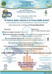CASTELVETRANO – Non è stato un semplice incontro scolastico, ma un vero e proprio “patto di cittadinanza” quello siglato ieri mattina con gli studenti nell’aula magna del Liceo Classico “G. Pantaleo” con il convegno dal titolo evocativo “Il Valore della Libertà e la Forza delle Scelte”. L’iniziativa promossa nell’ambito del service distrettuale Lions per l’educazione civica dal Lions Club di Castelvetrano, guidato dalla presidente Agata Calandro, ha trasformato i banchi di scuola in un laboratorio di consapevolezza, partendo da un presupposto tanto semplice quanto rivoluzionario: “Se ho il diritto di… ho il dovere di…”.