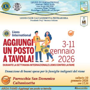 Il Lions club Caltanissetta Pietrarossa ha aderito alla Settimana internazionale contro la fame, promossa da Lions International, promuovendo sabato 10 gennaio il service Aggiungi un posto a tavola, voluto da Lions Multidistretto Italia e Distretto Sicilia. Insieme ad altre associazioni di volontariato del territorio, i soci Lions, guidati dal presidente Vincenzo Falzone, hanno promosso e organizzato una serata di beneficenza. Con i fondi raccolti, sono poi stati acquistati buoni spesa, consegnati al parroco della chiesa san Domenico perché vengano quindi distribuiti a quelle famiglie in difficoltà economica assistite dalla comunità parrocchiale. Insomma, un gesto di vicinanza e solidarietà verso gli altri. #lionssicilia #caltanissetta