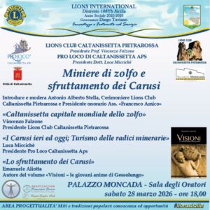 Sabato 28 marzo a Caltanissetta, presso la Sala degli oratori di Palazzo Moncada – Galleria civica d’arte, il Lions club Caltanissetta Pietrarossa e la Pro Loco, col patrocinio del Comune, nell’ambito del service distrettuale Lions Miti e tradizioni popolari: conoscenza ed opportunità, hanno organizzano insieme un incontro culturale dal titolo Miniere di zolfo e sfruttamento dei Carusi, che ha ripercorso parte della storia economica e sociale della città. Hanno relazionato i presidenti del Lions club, Enzo Falzone, e della Pro Loco, Luca Miccichè, nonché lo scrittore Emanuele Aliotta, autore del volume “Visioni. Le giovani anime di Gessolungo”, che parla proprio del tema dell’incontro, dove è stato ripercorso il “periodo d’oro” della città, centro mondiale dello sfruttamento dello zolfo, per poi decadere alla fine degli anni ’60 del secolo scorso, a seguito della crisi e della chiusura di tutti i siti minerari. E tutto questo è passato anche attraverso le grandi tragedie umane, la cui più nota è proprio quella del 1881 accaduta alla miniera di Gessolungo di cui parla il libro presentato, con lo scoppio dei gas sotterranei e il sacrificio di tantissime vite umane. All’evento hanno collaborato anche le associazioni “Francesco Amico” e “Royal Eagles Club” #lionssicilia #caltanissetta