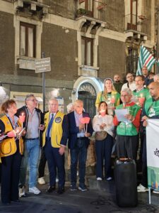 Al termine della funzione, una fiaccolata in piazza Stesicoro ha offerto spazio a letture e riflessioni proposte da lavoratori, studenti e rappresentanti del mondo associativo, nel segno della condivisione del comune impegno contro guerra e violenza. Tra gli interventi, quello della presidente del Lions Club Catania Alcantara Cinzia Di Gregorio.