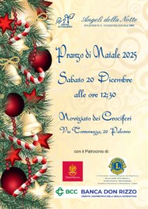 C’erano anche i soci dei club Lions della Zona 2 a servire a tavola e animare il pranzo di Natale promosso dagli Angeli della notte. Al Noviziato dei Crociferi di via Torremuzza, alla Kalsa, a Palermo i cinque club service (Partinico Serenianus, Palermo Normanna, Carini Riviera Palermo Ponente, Palermo Libertà e Corleone) che compongono la Zona guidata da Marina Reina hanno aderito all’iniziativa solidale promossa dall’associazione che assiste i senza casa, coloro che vivono per strada, gli “ultimi”, contribuendo così con il loro impegno solidale all’azione di vicinanza e affetto verso queste persone. L’iniziativa ha visto anche il patrocinio del Comune e della banca Don Rizzo. #lionssicilia #palermo
