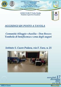 Mercoledì scorso tombolata e cena degli auguri con i ragazzi ospiti dell’Istituto sacro Cuore di Pedara (CT) per i soci del Lions club Catania Vallis Viridis (presidente Rita Passafiume), affiancati dai ragazzi della Comunità alloggio “Ausilia-Don Bosco”. Per tutti premi e regalini e tanta allegria e spensieratezza, in una atmosfera di solidarietà che ha “condito” la serata. Presente tra gli altri anche il GST distrettuale Lions Salvo Furnari. #lionssicilia #pedara