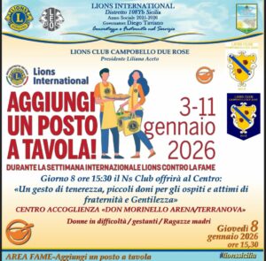 Ieri, nell’ambito della Settimana internazionale Lions contro la fame, il Lions club Campobello Due Rose, presieduto da Liliana Aceto, ha realizzato un significativo service al Centro di accoglienza “don Morinello Arena/Terranova”, struttura che ospita donne in difficoltà, gestanti e ragazze madri, con i loro bambini. Con l’iniziativa, che si inserisce nel service distrettuale Aggiungi un posto a tavola, i soci del club con sede a Campobello di Licata (AG) hanno voluto così esprimere la loro vicinanza agli ospiti della struttura e agli operatori sociali che vi lavorano, offrendo loro piccoli doni, semplice gesto di solidarietà, vicinanza e attenzione verso quella realtà locale. #lionssicilia #campobellodilicata