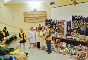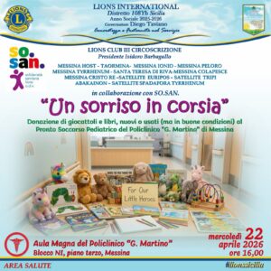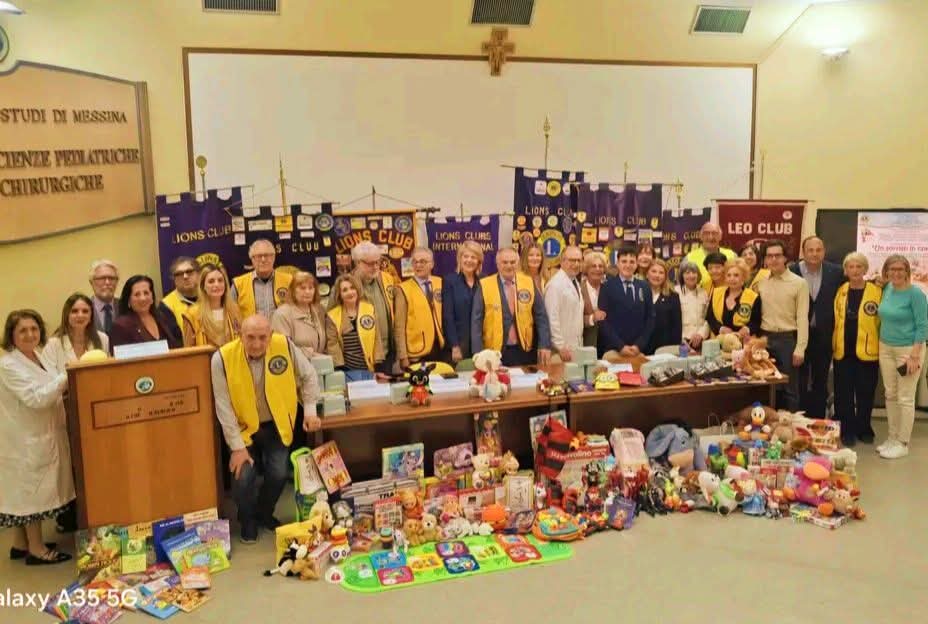 MESSINA – I Lions ancora una volta dedicano attenzione ai pazienti più piccoli e fragili con il service Un sorriso in corsia, promosso – mercoledì 22 aprile – dai club Lions della Terza Circoscrizione (presidente Isidoro Barbagallo), in collaborazione con So.San. (delegata Elisabetta Baradello). Un consistente quantitativo di giocattoli e libri per bambini è stato donato dai club service al Pronto soccorso pediatrico del Policlinico universitario di Messina, alla presenza del direttore generale dell’Azienda ospedaliera, dott.ssa Elvira Amata, del direttore del Dipartimento di pediatria, prof.Carmelo Romeo, del direttore del Pronto soccorso pediatrico, prof.ssa Eloisa Gitto, della Dott. Katia Munafò, co-organizzatrice e della direttrice dott.ssa Luciana Concetta Rigoli, della UOSD Thalassemia del Policlinico Universitario peloritano. Alla consegna presenti i presidenti delle Zone 7 e 8 Lions, Giuseppe Pernice e Angela Patti. Giocattoli e libri saranno così offerti ai piccoli pazienti che afferiscono al PS, rendendo più friendly l’accesso sanitario dei bambini.